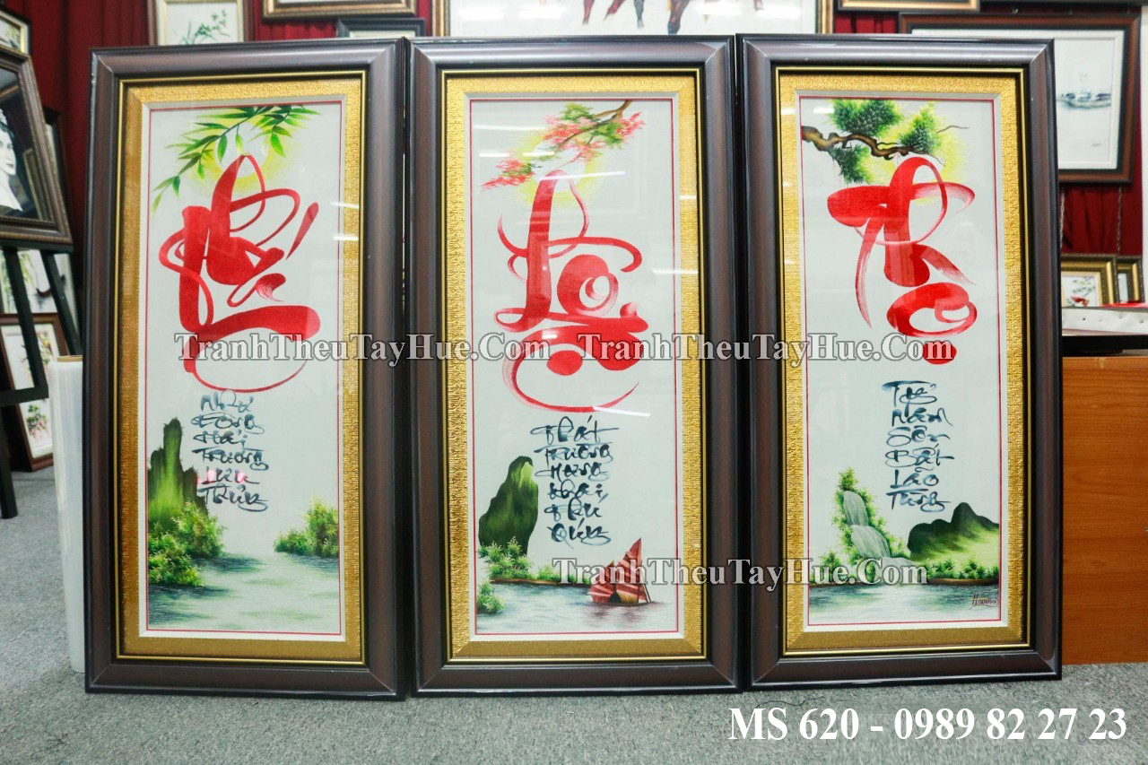 Ở các vị trí như sau lưng bộ 3 ông Phúc Lộc Thọ, phía trên tivi, hay phía trên các cặp lục bình những nơi này thường để lại cho bạn 1 vị trí tuyệt hảo để treo tranh thêu, Bạn nên treo cách những vị trí ấy khoảng 15-20cm là phù hợp