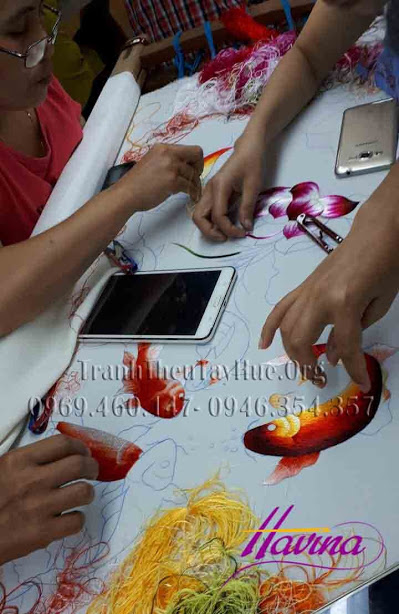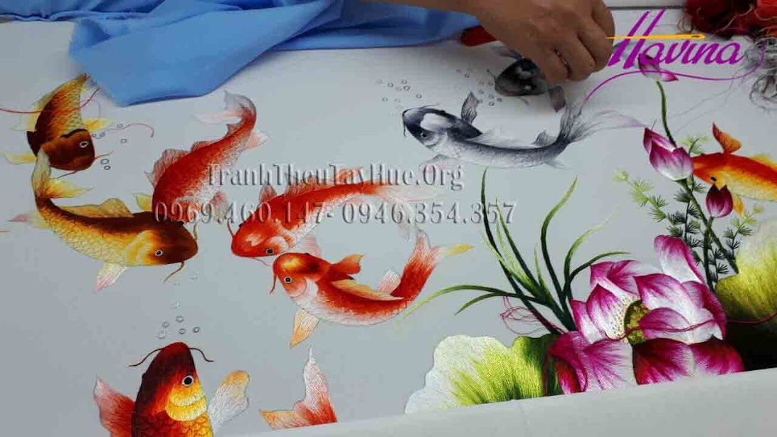 Anh Cương nhân chuyến về thăm nhà ở Việt Nam đã tìm đến Tranh thêu tay Huế và đặt thêu bức tranh thêu Cá chép hoa sen ms 04 để treo tại nhà anh ở Mỹ.
