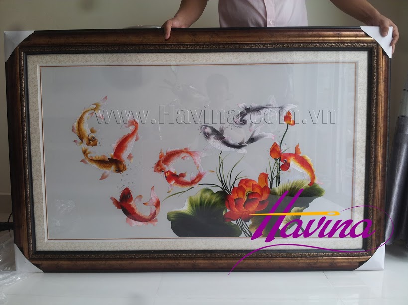 Tranh thêu Cá chép hoa sen thuộc dòng tranh phong thủy, ngoài tác dụng trang trí, tranh có tác dụng điều hòa sinh khí, mang lại tài lộc, sức khỏe, thịnh vượng cho căn nhà, đồng thời chấn tà khí, xua đuổi những điềm dữ.