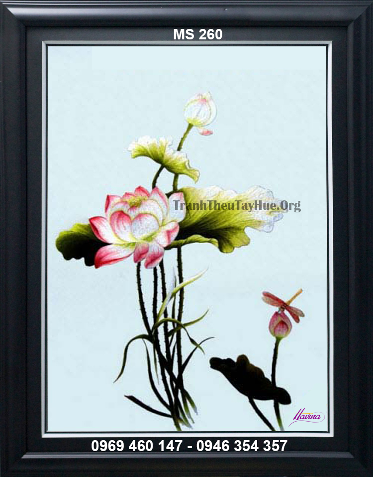 Tranh thêu hoa sen không nổi bật, quyến rũ như colico, cũng không kiêu sa lộng lẫy như những đóa mẫu đơn. Tranh thêu hoa sen vừa mộc mạc, bình dị, chân chất, lại vừa cuốn hút người đối diện một cách lạ thường.