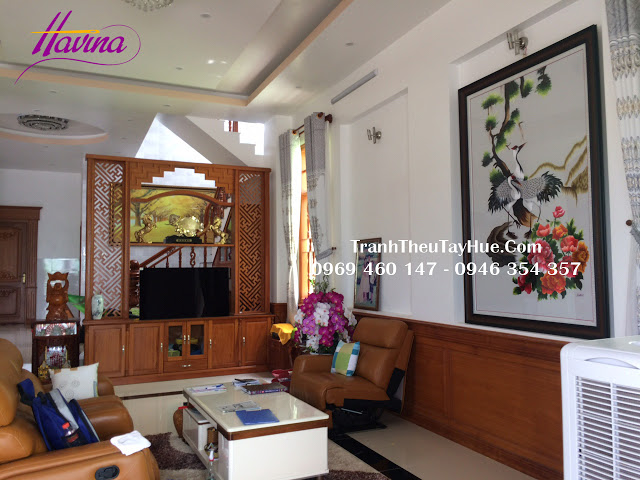 Bức tranh thêu tùng hạc hoa mẫu đơn được treo ở phòng khách nhà chị Nam sau khi hoàn thiện