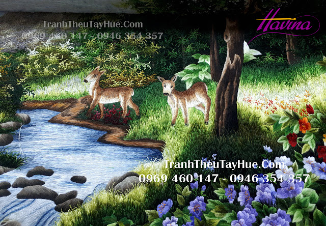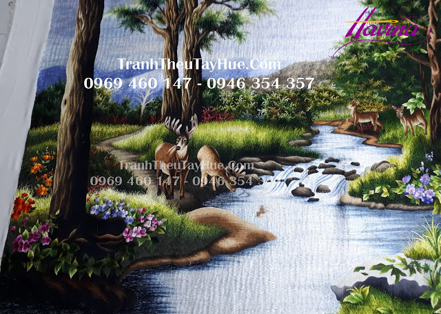 Bức tranh thêu phong cảnh ms 358 mô tả một khung cảnh rừng cây xanh ngắt với đồi núi trùng điệp, trọng tâm của bức tranh là hình ảnh dòng suối trong vắt. Sắc xanh của lá, của trời và nước như hòa quyện vào nhau tạo nên cảm giác dịu nhẹ, rất thoải mái cho người thưởng thức.