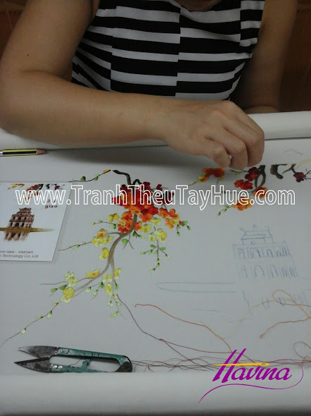 Công ty BDT ở Hà Nội liên hệ với chúng tôi để đặt thêu 7 bức tranh thêu Cành đào Hồ Gươm ms 448 theo yêu cầu để làm quà tặng cho đối tác nhân chuyến đi công tác của của công ty.
