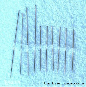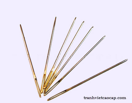 Kim dùng cho tranh thêu tay có nhiều kích thước khác nhau, có kim thường và kim 2 đầu dùng thêu khung gỗ tay trên tay dưới không cần quay đầu kim. Thợ thêu truyền thống coi kim thêu như báu vật, luôn giữ gìn chúng cẩn thận. Kim thêu truyền thống được rèn thủ công thường thô, nháp và to. Trước khi sử dụng người thợ thường mài láng, sau khi sử dụng nhiều lần, kim thêu dần trở nên láng bóng, thuôn nhỏ đủ độ cần thiết làm cho đường kim, mủi chỉ tinh xảo hơn, chuẩn hơn và thân quen với “chủ nhân” hơn.