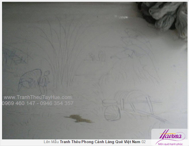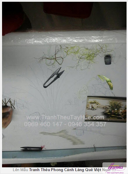 Lên mẫu tranh thêu phong cảnh làng quê mẫu mà chị Ngọc chọn