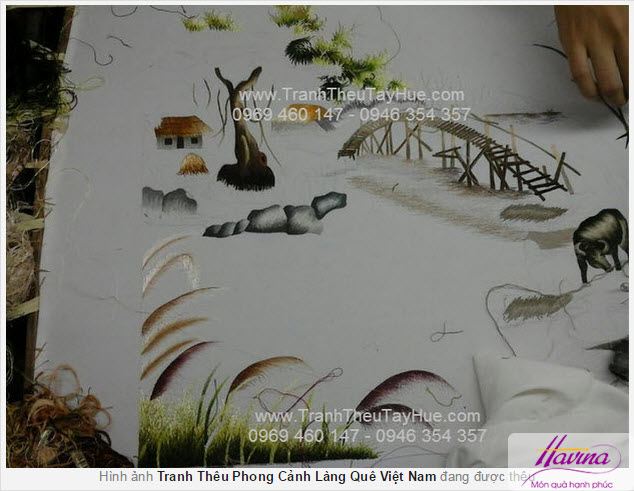 Sau đây là những hình ảnh của bức tranh thêu phong cảnh làng quê Việt Nam sau khi thêu được vài ngày, tuy chỉ mới vài ngày nhưng khi nhìn vào bức tranh thêu ta đã có cảm giác như đã thật sự hoàn thiện, một sự nổ lực của những nghệ nhân thuê: