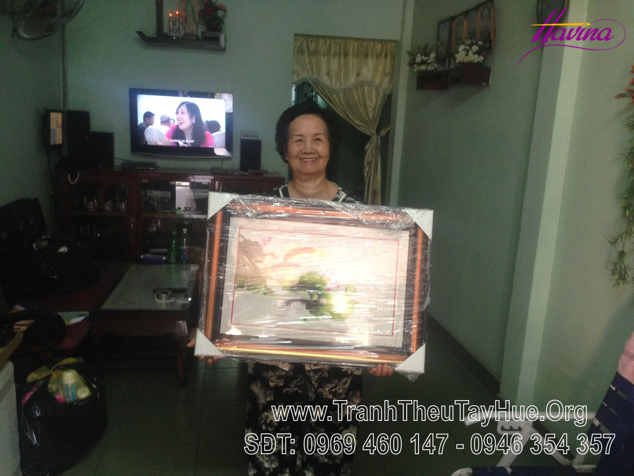 Nhân dịp tân gia của người thân ở nước ngoài, cô Ánh (ở Phạm Thế Hiển, quận 8) đã đến tham quan phòng tranh của Tranh thêu tay Huế và đặt mua bức tranh thêu Cá chép hoa sen để dành tặng cho người thân của mình.