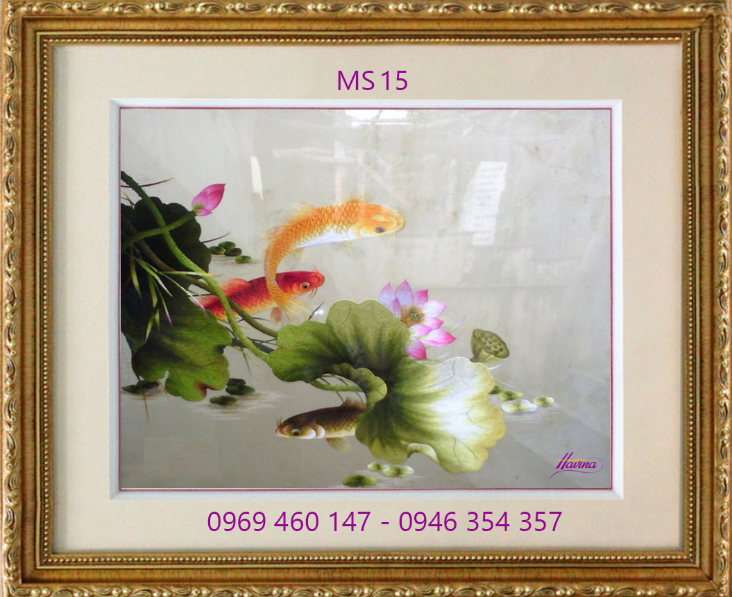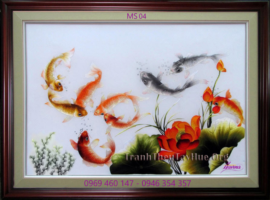 Sau khi đặt mua bức tranh thêu Cá chép hoa sen mã số 15 để làm quà cho người thân ở nước ngoài nhân dịp tân gia, cô Ánh tiếp tục tin tưởng và đặt hàng tranh thêu tay Huế thêm một bức tranh Cá chép hoa sen với mã số 04.