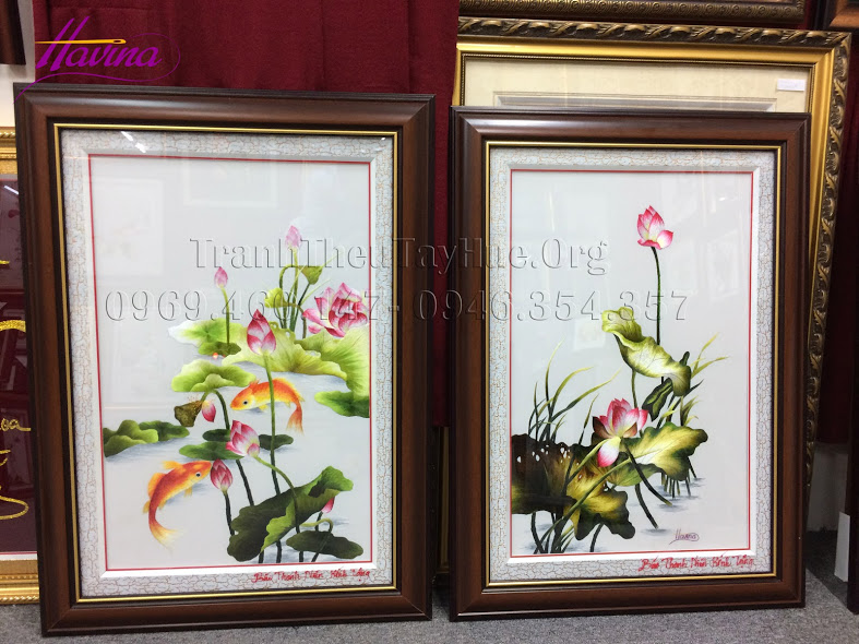 Hai bức tranh thêu hoa sen mà chị Vân Anh đặt mua cho cơ quan
