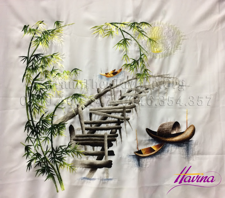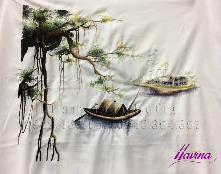 Tranh thêu phong cảnh làng quê là một dòng tranh rất được ưa chuộng hiện nay. Với những khung cảnh bình dị đặc trưng của làng quê Việt Nam như cây đa, bến nước hay mái nhà tranh..., bức tranh sẽ mang đến những cảm xúc rất quen thuộc và bình dị cho người thưởng thức.