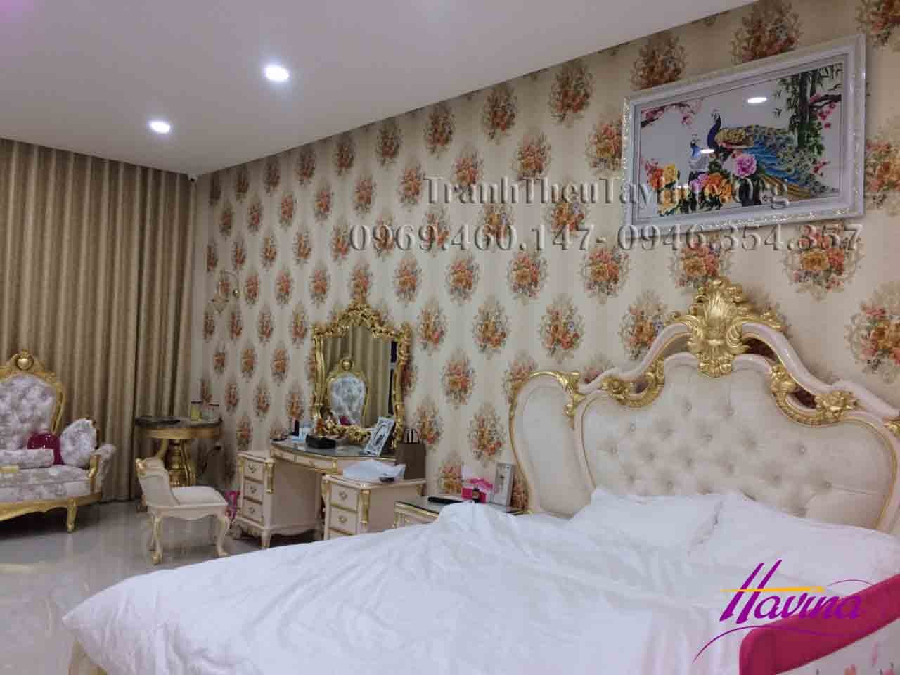 Chị Hạnh treo bức tranh thêu chim công ở phòng ngủ nhà mình
