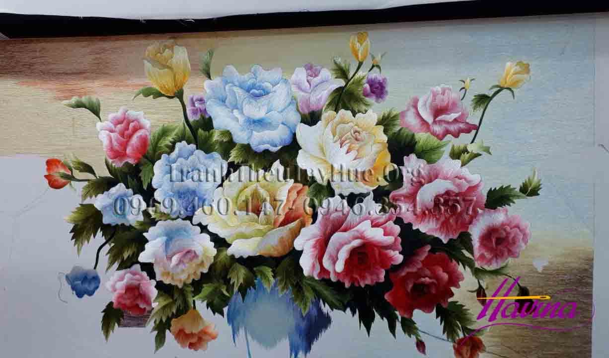 Bức tranh thêu giỏ hoa có tông màu pastel rất nền nã và cuốn hút. Đôi bàn tay khéo léo của những nghệ nhân Huế đã hoàn thiện một bức tranh rât đẹp, rất có hồn.