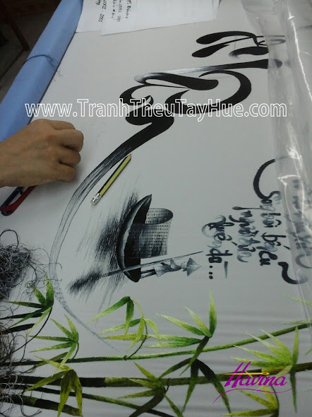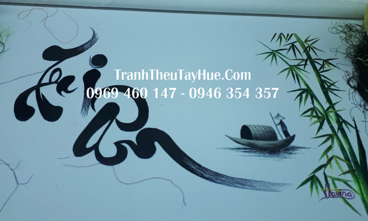 Điểm nhấn của bức tranh này là dòng chữ Tri ân được thêu khá to và sắc nét. Thoạt nhìn, bạn sẽ nghĩ dòng chữ này được vẽ nên từ nét bút thư pháp mềm mại của một bàn tay tài hoa nào đó. Sự điêu luyện và tài tình của các nghệ nhân Huế đã tạo nên những nét chữ vô cùng sắc sảo và tinh tế.