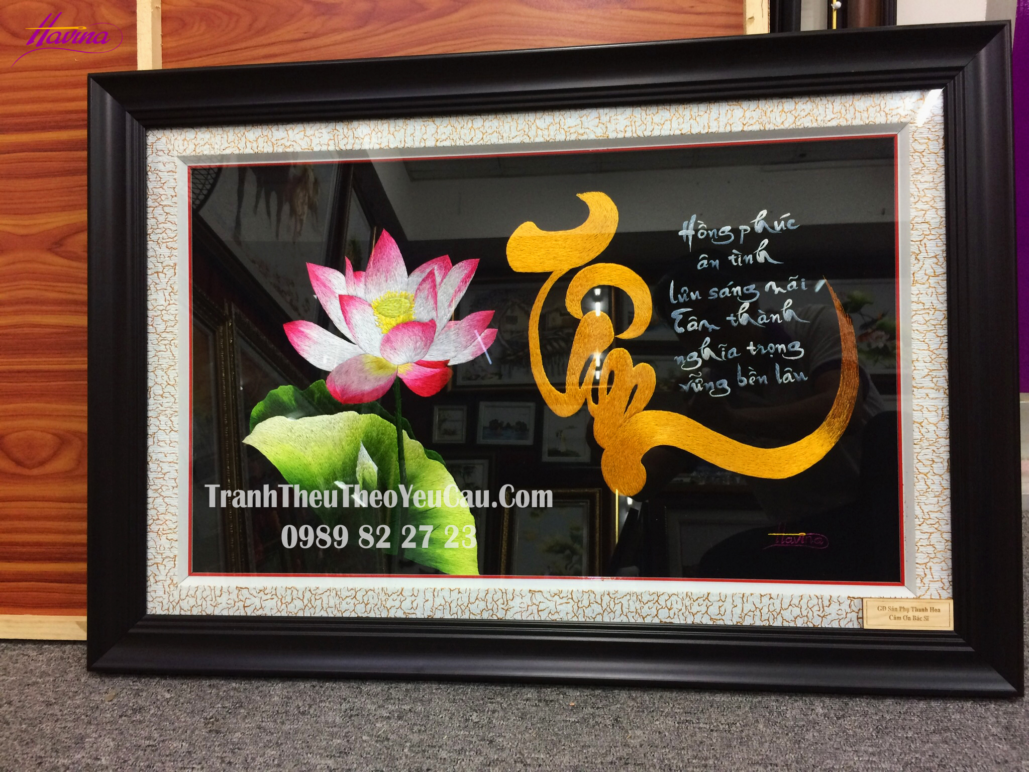 Tranh thêu tay chữ Tâm hoa sen là món quà ý nghĩa mà chị Hoa gửi đến vị bác sĩ của mình