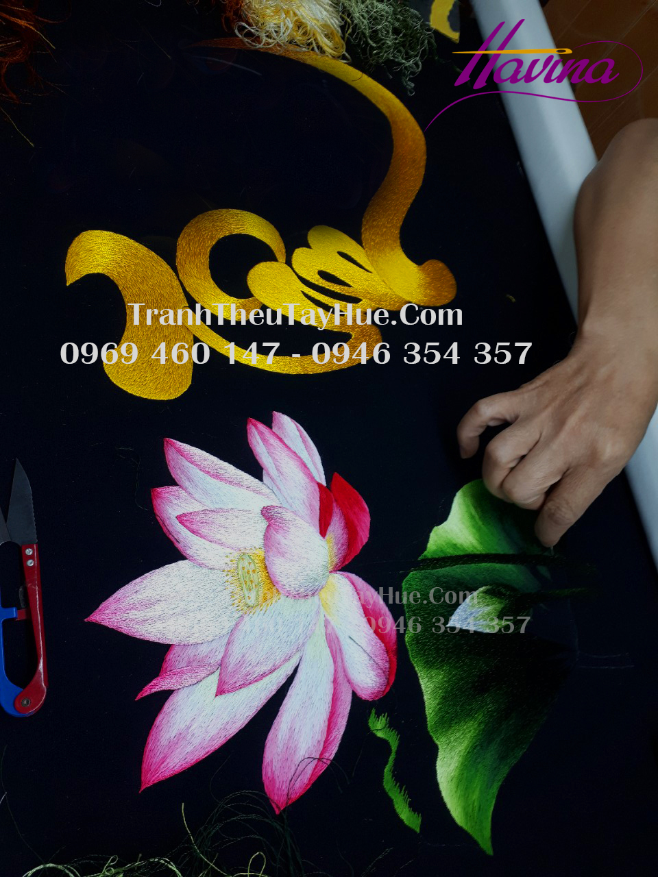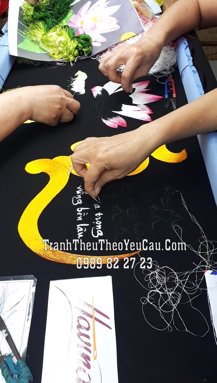 Quá trình các nghệ nhân bên mình thực hiện bức tranh thêu tay chữ Tâm hoa sen