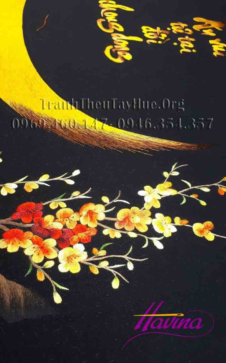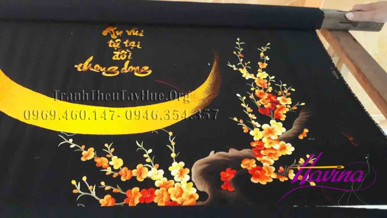 Bức tranh thêu chữ An được thêu trên nền đen rất nổi bật, đáng chú ý là chi tiết cành hoa mai trông vô cùng sặc sỡ và hút mắt. Các nghệ nhân Huế đã làm nên một bức tranh thêu chữ An rất tinh tế và sắc sảo.