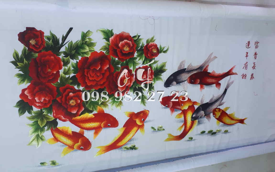 Đây là một trong những tác phẩm được rất nhiều người yêu thích. Bởi tác phẩm là sự kết hợp giữa những bông hoa mẫu đơn một loài hoa được ví cho sắc đẹp thanh cao quý phái. Cùng với đó là 9 chú cá chép mang đến tiền tài và vận may cho bạn.