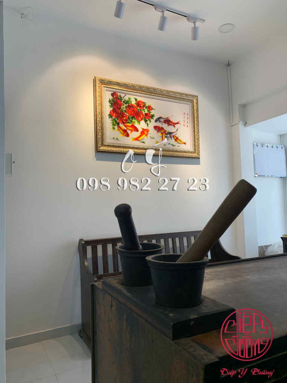 Bức tranh thêu cá chép hoa mẫu đơn được anh treo ngay phòng tiếp khách của phòng khám mình. Tạo nên điểm nổi bậc ngay tại cơ quan của anh.