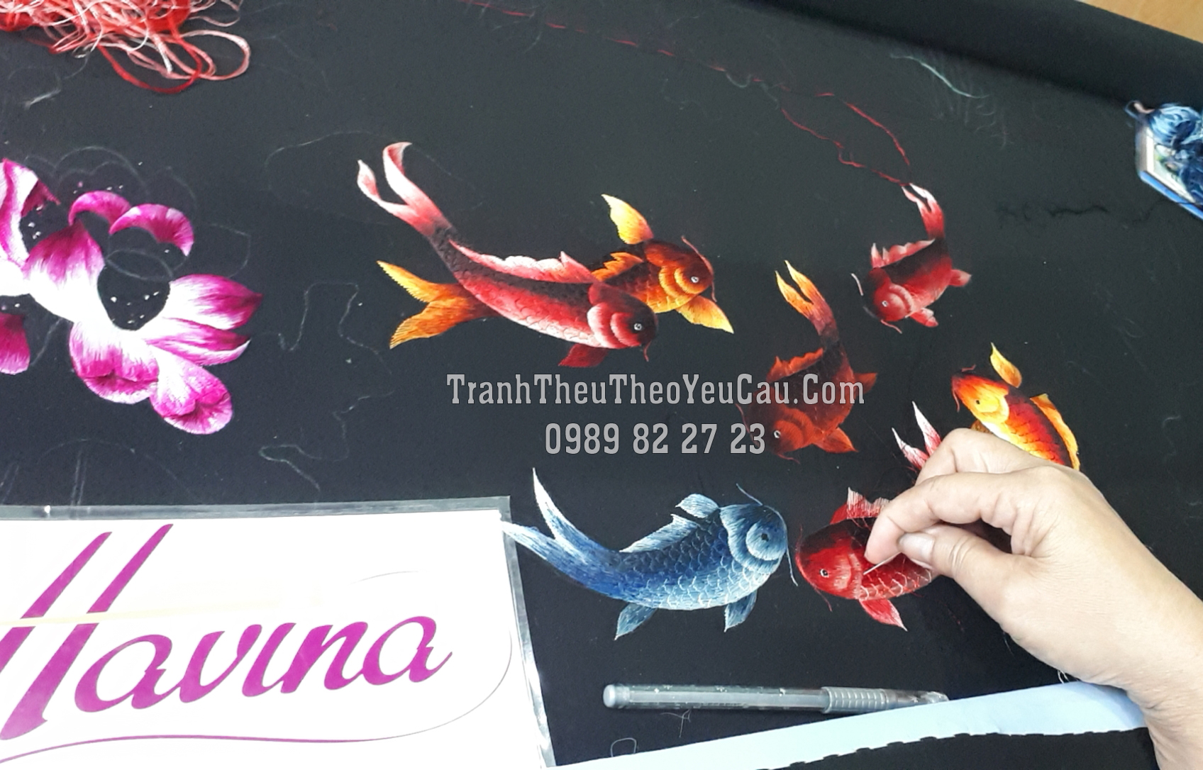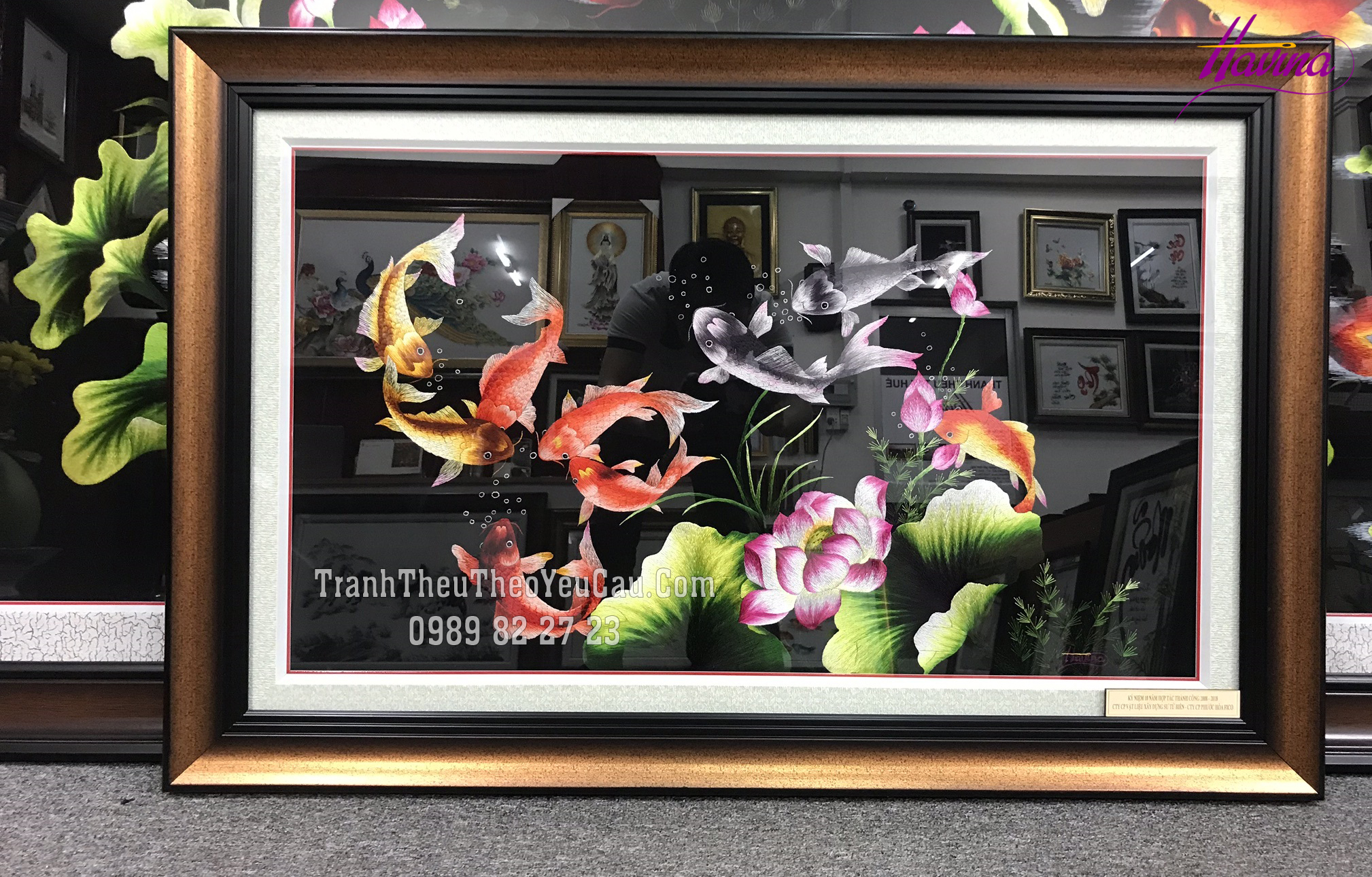 Tranh thêu Cửu Ngư Quần Hội kết hợp hình ảnh 9 con Cá chép và hoa sen là biểu tượng cho sự dư dả dài lâu, sự sung túc, tài lộc dồi dào