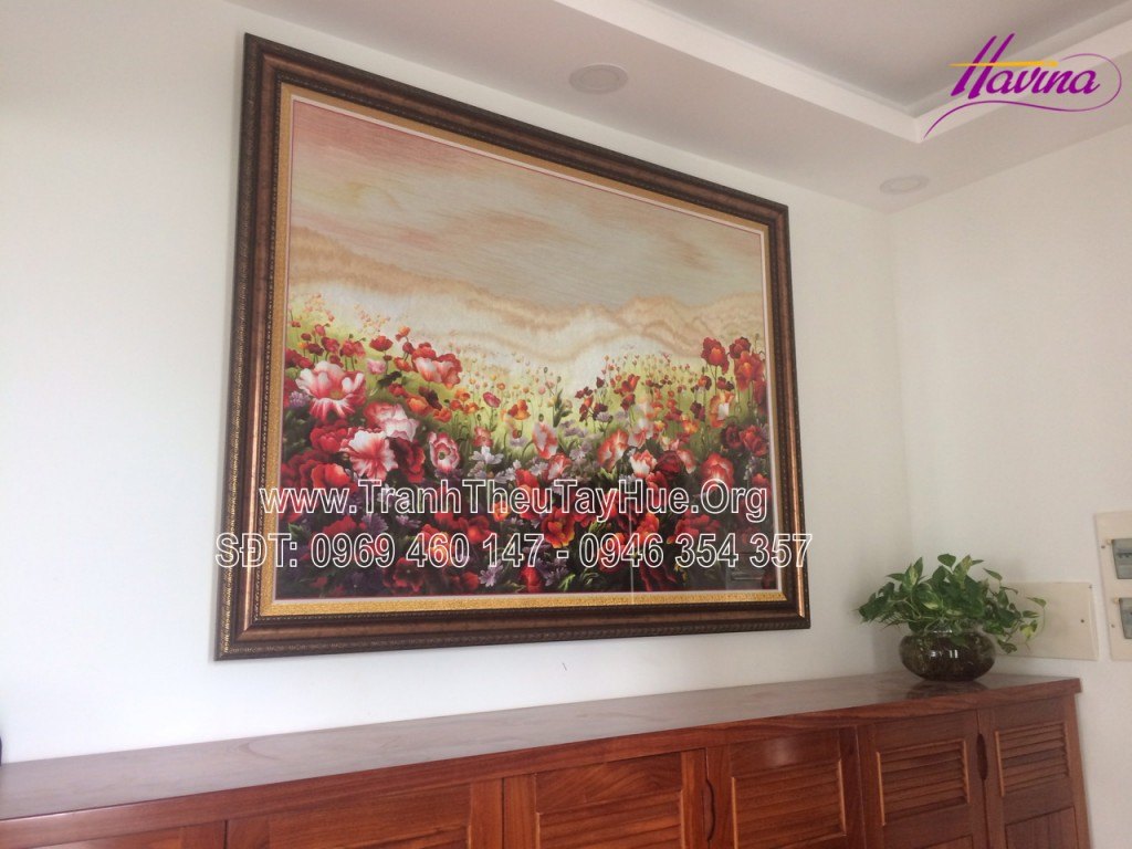 TRANH THÊU HOA COLICO ĐƯỢC TREO TẠI PHÒNG KHÁCH Ở CĂN HỘ CHUNG CƯ NHÀ CHỊ PHƯƠNG