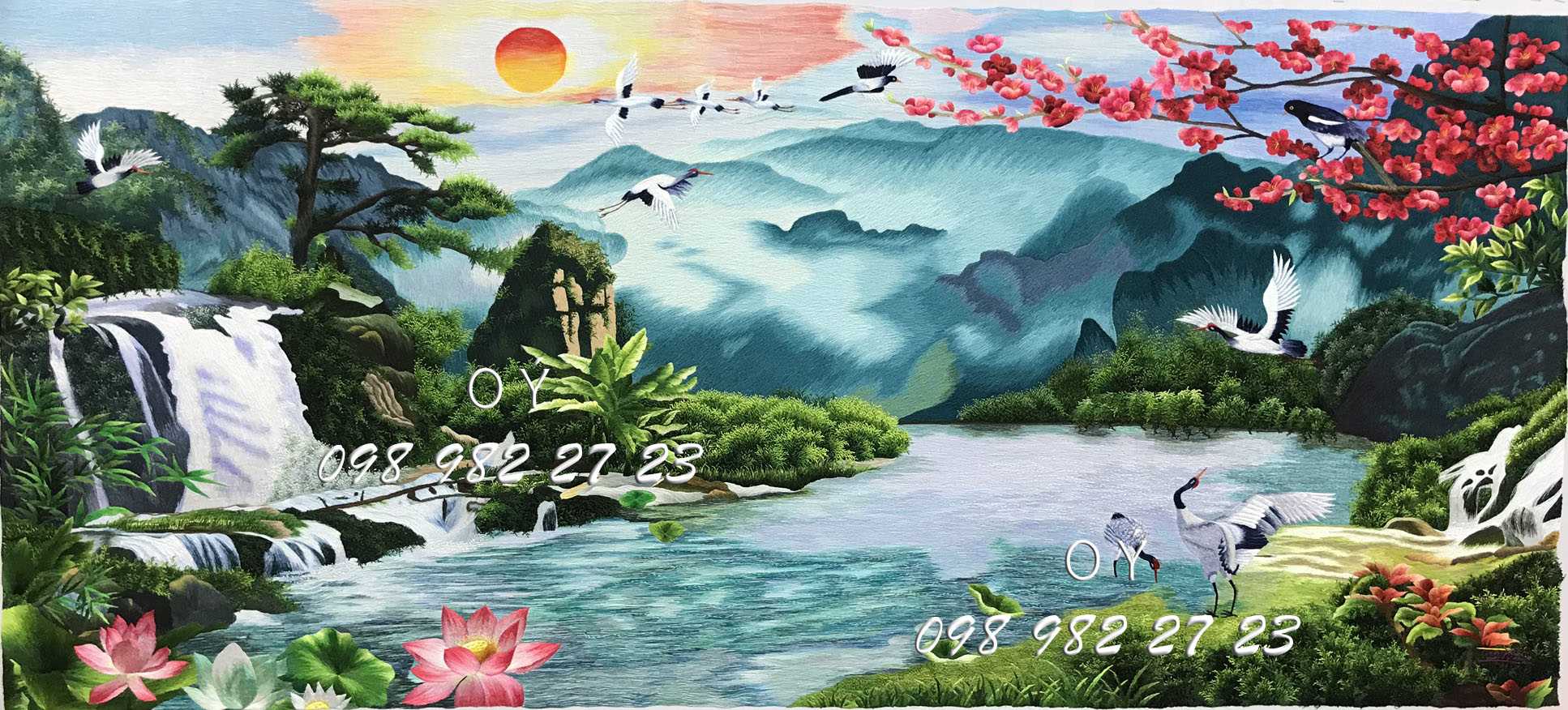 Những dãy núi trùng trùng điệp điệp bên trên mình dải mây trắng xóa, ánh mặt trời đỏ rực cùng với màu rừng cây xanh ngắt. Những thác nước đổ từ trên cao xuống như một dải lụa dài hòa cùng tiếng chim muông của đất trời. Tất cả tạo nên bức tranh thêu Sơn thủy hữu tình kì vĩ, đẹp đến nao lòng. Là bức tranh treo tường phong cảnh thiên nhiên nhưng lại hữu tình và đầy thi vị.