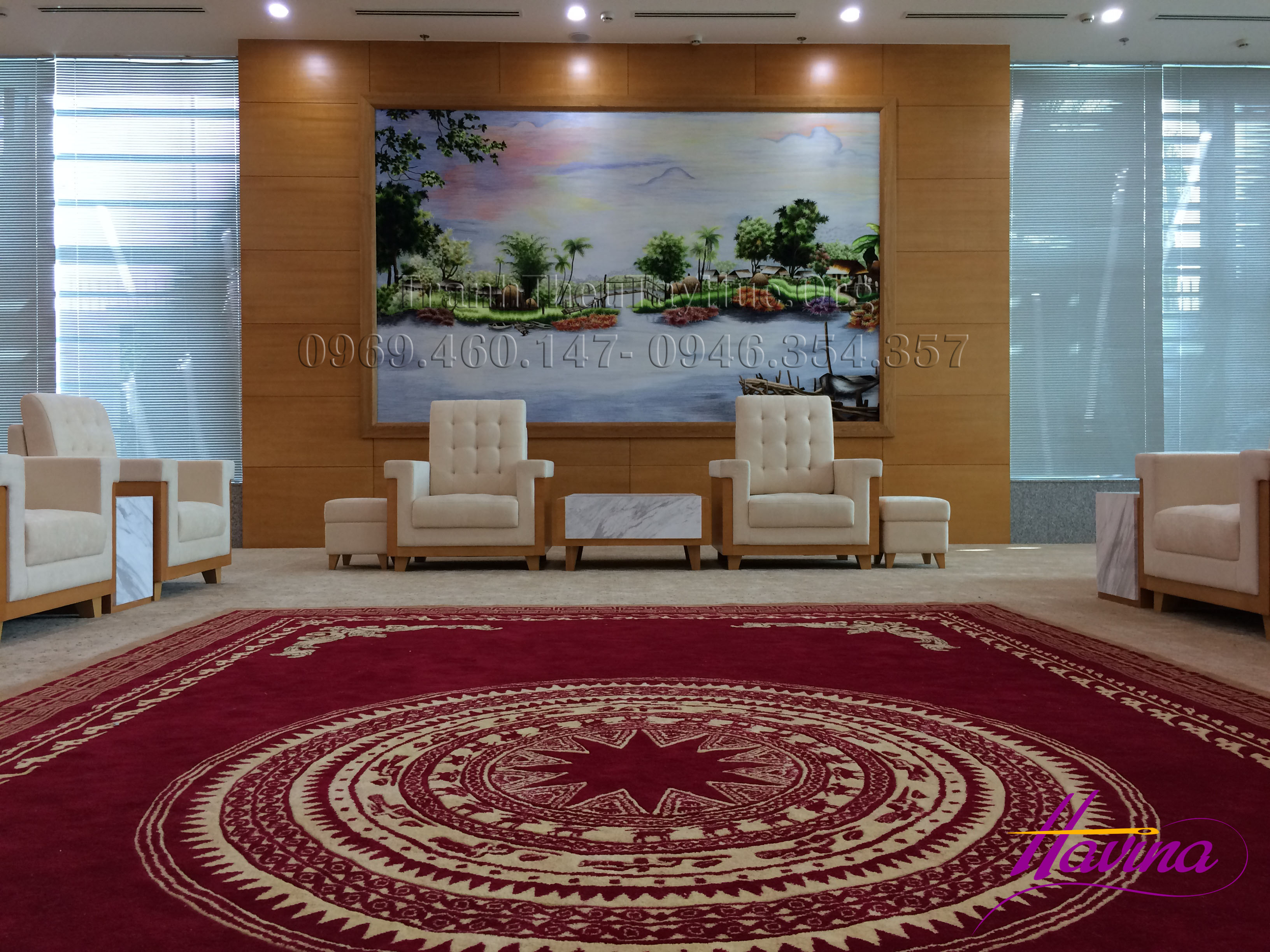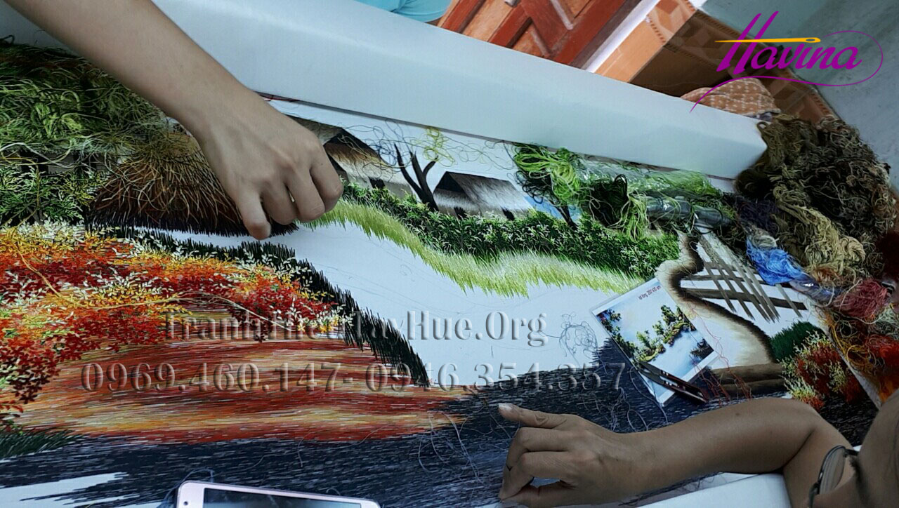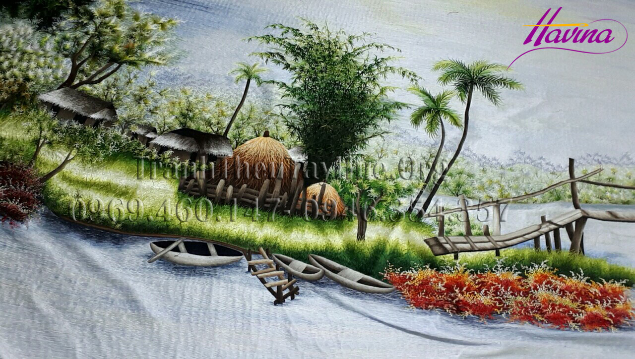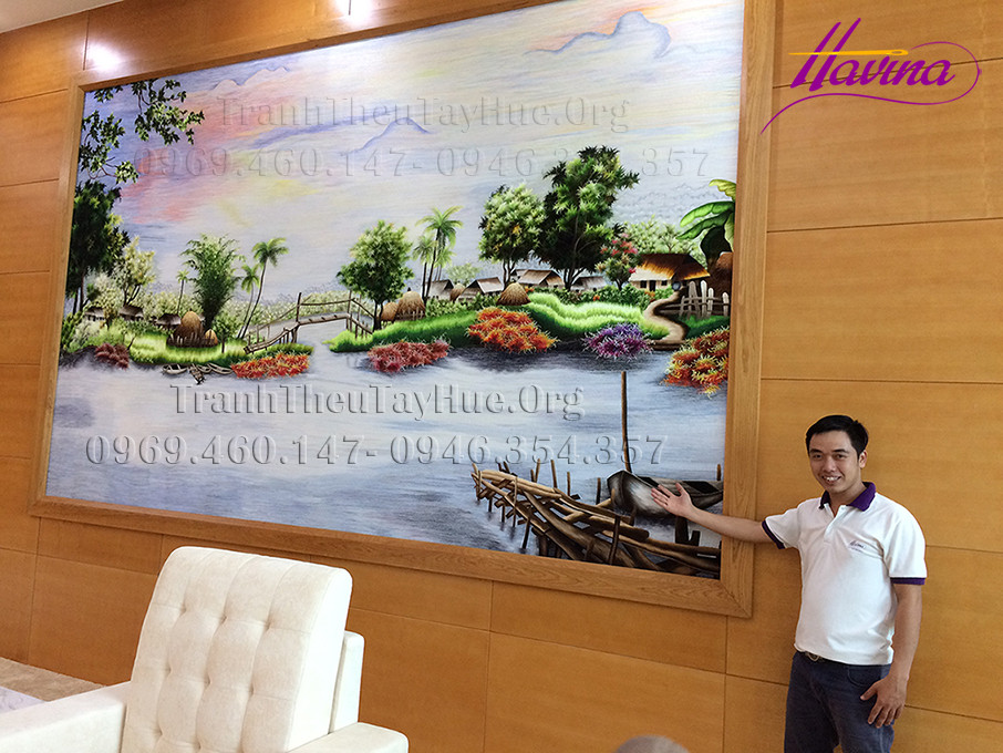 Tác phẩm tranh thêu phong cảnh Làng quê của tranh thêu tay Huế - Havina vừa hoàn thiện việc trưng bày tại phòng Quốc Khách tiếp đón Thủ tướng và các đại biểu cấp cao tham dự Tuần lễ cấp cao APEC 2017 ở sân bay quốc tế Đà Nẵng.