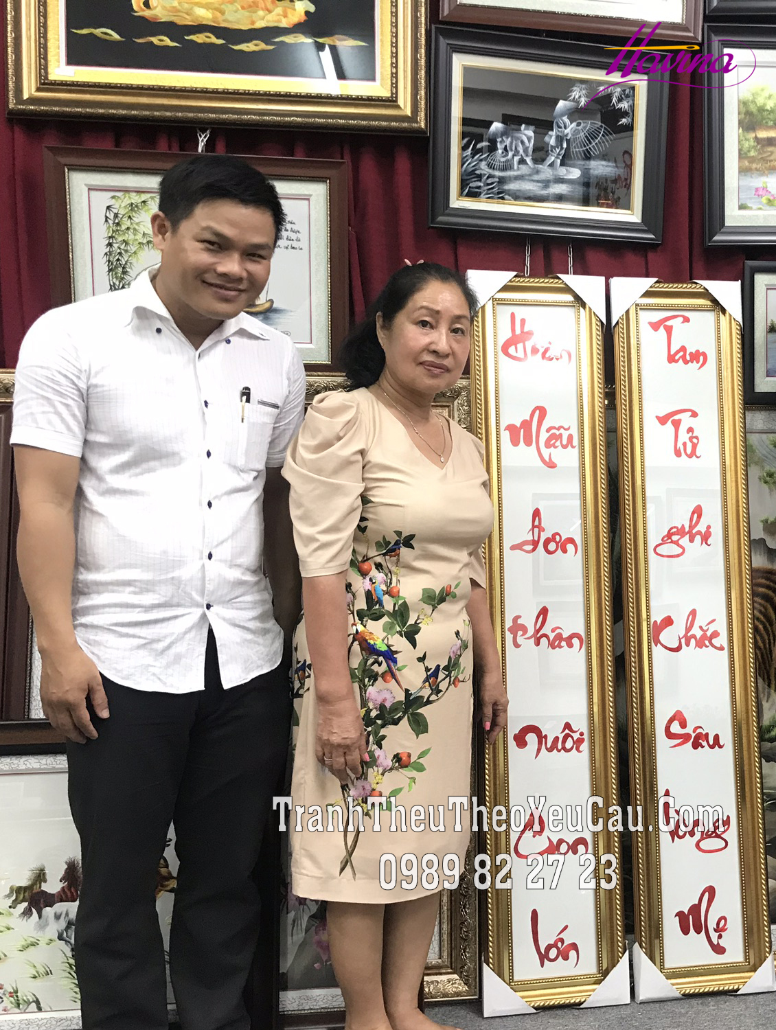 Cô Xuân đến từ Long An, sau khi tìm hiểu và đọc những bài viết về tranh thêu theo yêu cầu của chúng tôi đã liên hệ và đến showroom của Havina để đặt một bộ câu đối để treo ở trong nhà, tưởng nhớ đến công ơn người MẸ của Cô.