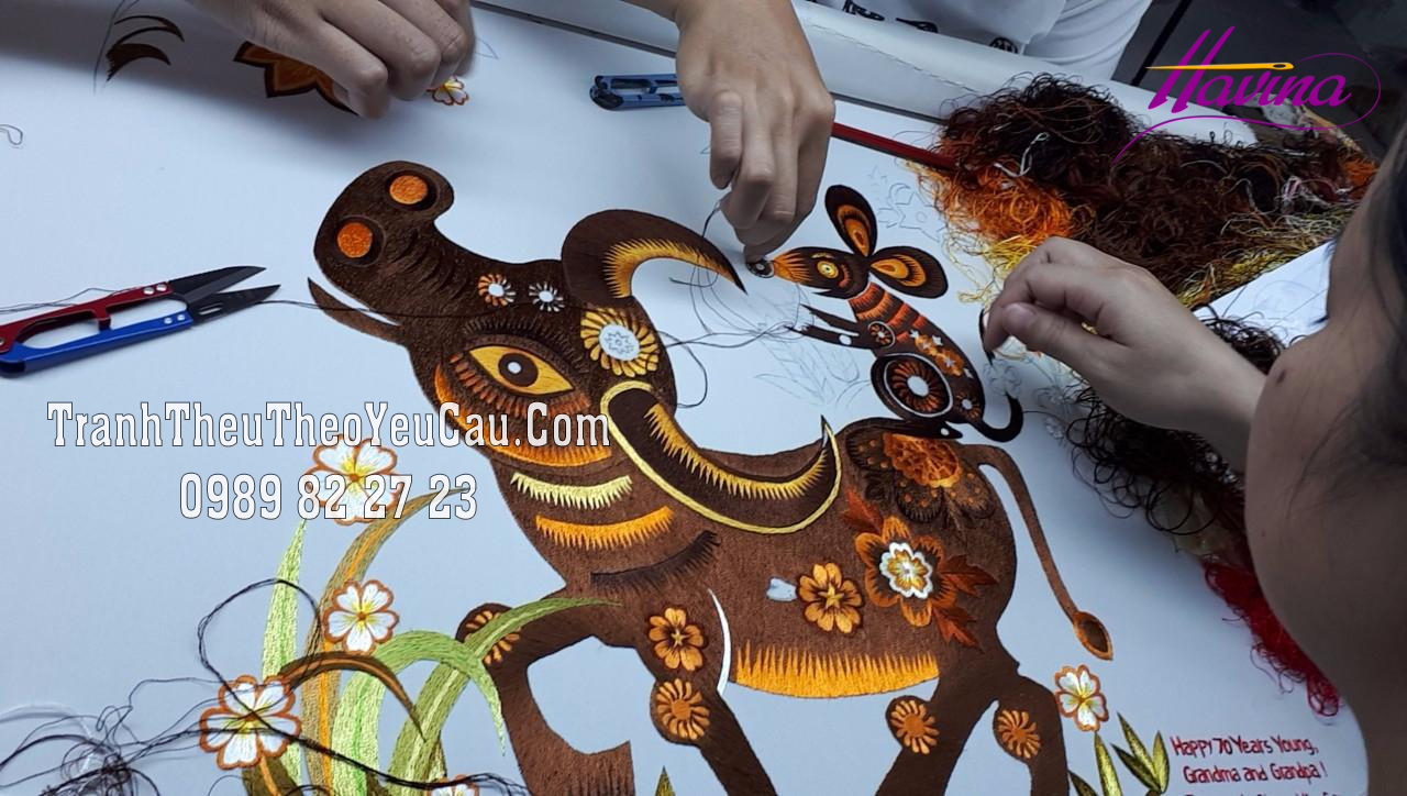 Bên mình đã thêu một bức tranh rất đặc biệt theo yêu cầu của chị. Đó là bức tranh thêu “Vợ chồng trâu và chuột”, đây cũng là hai con giáp tượng trưng cho tuổi của ông bà chị Nguyệt.