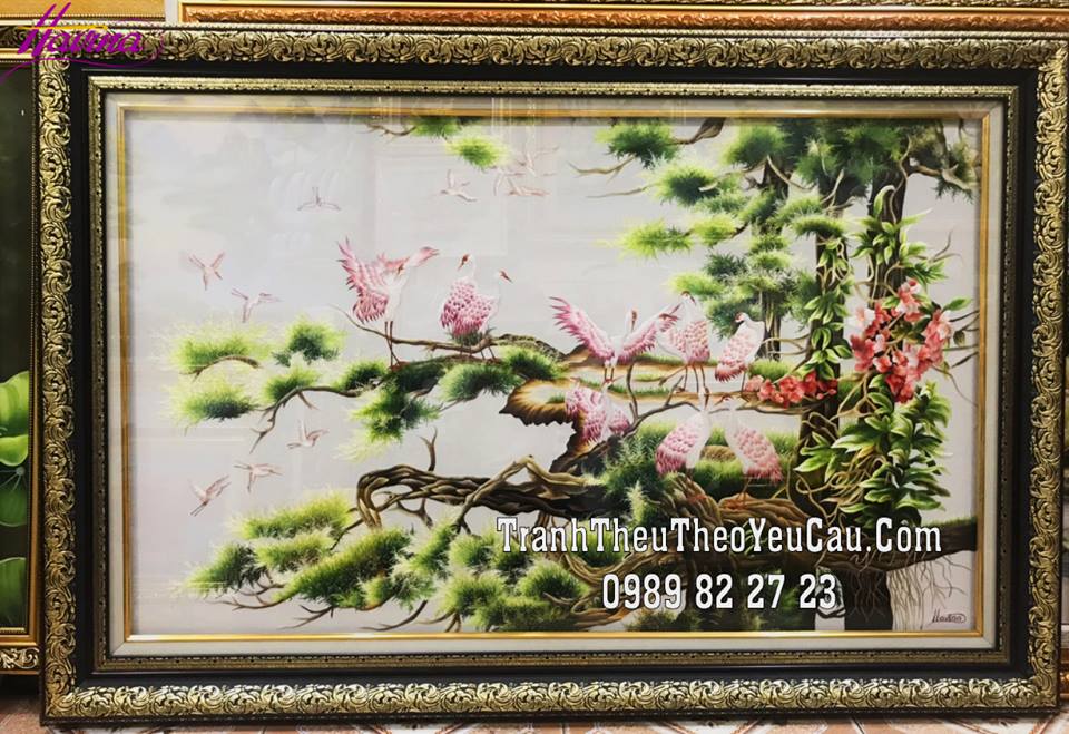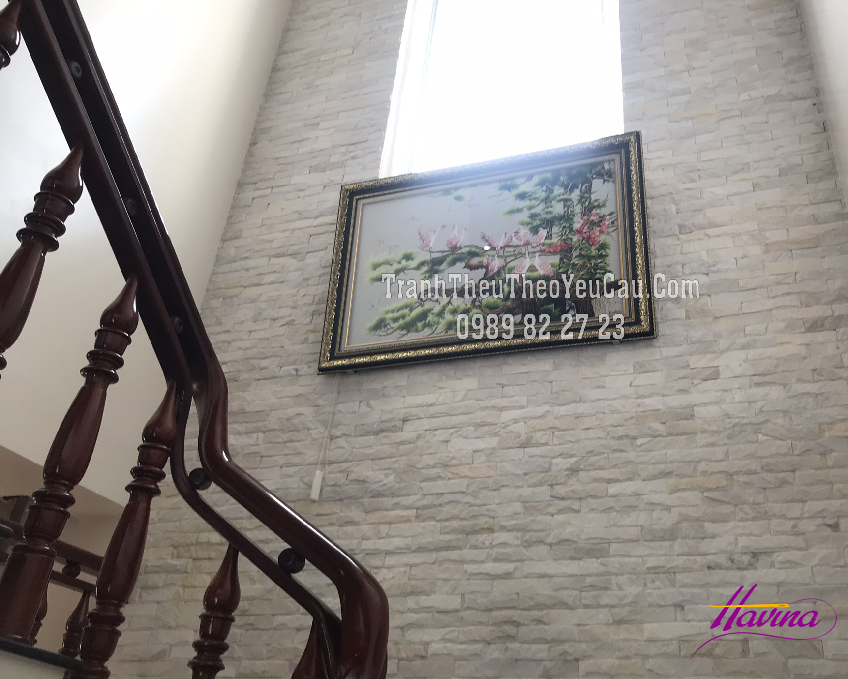 Tranh thêu treo cầu thang và ý nghĩa trong phong thủy. Tranh thêu treo cầu thang thường mang chủ đề: tùng hạc diên niên, hoa lá, phong cảnh thiên nhiên...