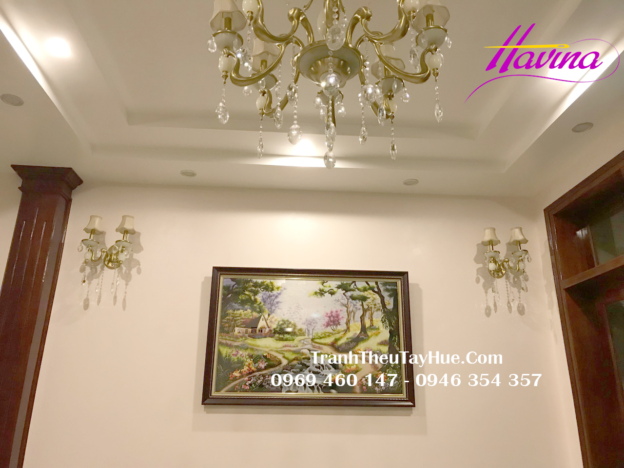 Vợ chồng chị Thu (Hà Nội) đặt tranh thêu phong cảnh hữu tình khổ lớn để treo ở phòng khách
