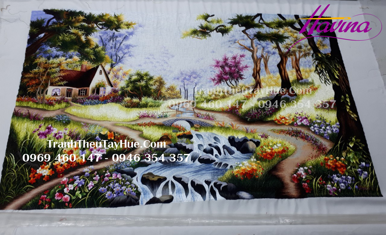 Tranh thêu phong cảnh hữu tình là tổng hòa những vẻ đẹp ban sơ nhất của thiên nhiên. Cảnh hùng vĩ của núi non hòa quyện với nét mềm mại, uyển chuyển của non nước. Sơn thủy đứng cạnh nhau, hòa quyện vào nhau, tạo nên sự hoàn hảo, sự luân chuyển tuần hoàn và sức sống bền bỉ thách thức với thời gian.