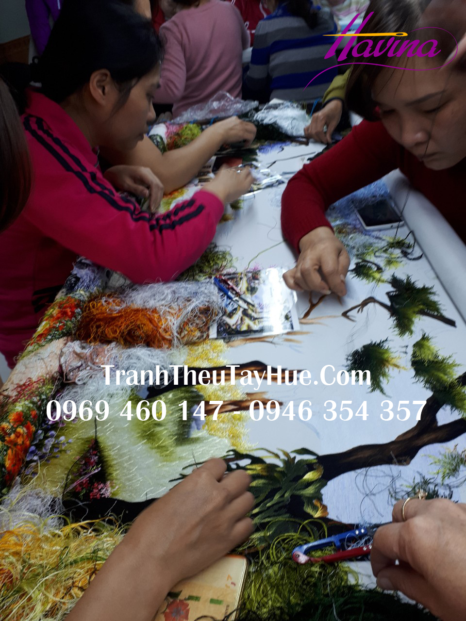 Vợ chồng chị Thu đến từ khu đô thị mới Văn Phú, phường Phú La, quận Hà Đông, Hà Nội đặt thêu bức tranh thêu phong cảnh hữu tình khổ lớn để treo ở phòng khách nhà chị.