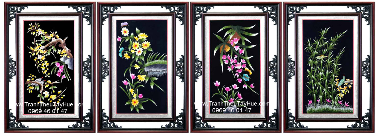 Tranh thêu tay truyền thống Tứ Qúy Mai Lan Trúc Cúc( hoặc là một loại khác là Tứ Bình Tùng Cúc Trúc Mai) là tranh thêu truyền thống của Việt Nam được thêu HOÀN TOÀN THỦ CÔNG BẰNG TAY, bởi những thợ thêu chuyên tâm, lành nghề và dày kinh nghiệm của đất kinh thành Huế, những bức tranh Tứ Qúy (Tứ Bình) này sử dụng các kỹ thuật thêu truyền thống đặc trưng của xứ Huế. Tranh thêu tay Tứ Qúy Mai Lan Trúc Cúc( hoặc là một loại khác là Tứ Bình Tùng Cúc Trúc Mai) không chỉ là để trang trí mà còn mang nhiều ý nghĩa cầu may mắn, phú quý, sung túc và mang cả những yếu tố phong thủy trong đó.
