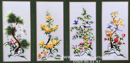 Tranh thêu tay truyền thống Tứ Qúy Mai Lan Trúc Cúc( hoặc là một loại khác là Tứ Bình Tùng Cúc Trúc Mai) là tranh thêu truyền thống của Việt Nam được thêu HOÀN TOÀN THỦ CÔNG BẰNG TAY, bởi những thợ thêu chuyên tâm, lành nghề và dày kinh nghiệm của đất kinh thành Huế, những bức tranh Tứ Qúy (Tứ Bình) này sử dụng các kỹ thuật thêu truyền thống đặc trưng của xứ Huế. Tranh thêu tay Tứ Qúy Mai Lan Trúc Cúc( hoặc là một loại khác là Tứ Bình Tùng Cúc Trúc Mai) không chỉ là để trang trí mà còn mang nhiều ý nghĩa cầu may mắn, phú quý, sung túc và mang cả những yếu tố phong thủy trong đó.
