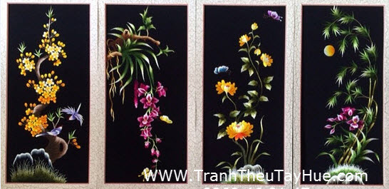 Tranh thêu tay truyền thống Tứ Qúy Mai Lan Trúc Cúc( hoặc là một loại khác là Tứ Bình Tùng Cúc Trúc Mai) là tranh thêu truyền thống của Việt Nam được thêu HOÀN TOÀN THỦ CÔNG BẰNG TAY, bởi những thợ thêu chuyên tâm, lành nghề và dày kinh nghiệm của đất kinh thành Huế, những bức tranh Tứ Qúy (Tứ Bình) này sử dụng các kỹ thuật thêu truyền thống đặc trưng của xứ Huế. Tranh thêu tay Tứ Qúy Mai Lan Trúc Cúc( hoặc là một loại khác là Tứ Bình Tùng Cúc Trúc Mai) không chỉ là để trang trí mà còn mang nhiều ý nghĩa cầu may mắn, phú quý, sung túc và mang cả những yếu tố phong thủy trong đó.