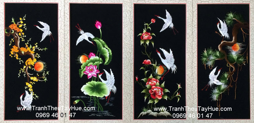 Tranh thêu tay truyền thống Tứ Qúy Mai Lan Trúc Cúc( hoặc là một loại khác là Tứ Bình Tùng Cúc Trúc Mai) là tranh thêu truyền thống của Việt Nam được thêu HOÀN TOÀN THỦ CÔNG BẰNG TAY, bởi những thợ thêu chuyên tâm, lành nghề và dày kinh nghiệm của đất kinh thành Huế, những bức tranh Tứ Qúy (Tứ Bình) này sử dụng các kỹ thuật thêu truyền thống đặc trưng của xứ Huế. Tranh thêu tay Tứ Qúy Mai Lan Trúc Cúc( hoặc là một loại khác là Tứ Bình Tùng Cúc Trúc Mai) không chỉ là để trang trí mà còn mang nhiều ý nghĩa cầu may mắn, phú quý, sung túc và mang cả những yếu tố phong thủy trong đó.