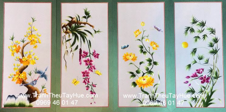 Tranh thêu tay truyền thống Tứ Qúy Mai Lan Trúc Cúc( hoặc là một loại khác là Tứ Bình Tùng Cúc Trúc Mai) là tranh thêu truyền thống của Việt Nam được thêu HOÀN TOÀN THỦ CÔNG BẰNG TAY, bởi những thợ thêu chuyên tâm, lành nghề và dày kinh nghiệm của đất kinh thành Huế, những bức tranh Tứ Qúy (Tứ Bình) này sử dụng các kỹ thuật thêu truyền thống đặc trưng của xứ Huế. Tranh thêu tay Tứ Qúy Mai Lan Trúc Cúc( hoặc là một loại khác là Tứ Bình Tùng Cúc Trúc Mai) không chỉ là để trang trí mà còn mang nhiều ý nghĩa cầu may mắn, phú quý, sung túc và mang cả những yếu tố phong thủy trong đó.