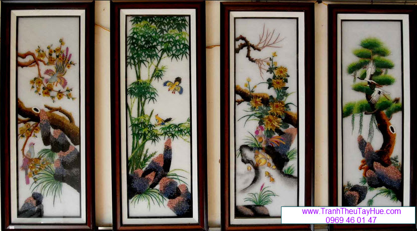 Tranh thêu tay truyền thống Tứ Qúy Mai Lan Trúc Cúc( hoặc là một loại khác là Tứ Bình Tùng Cúc Trúc Mai) là tranh thêu truyền thống của Việt Nam được thêu HOÀN TOÀN THỦ CÔNG BẰNG TAY, bởi những thợ thêu chuyên tâm, lành nghề và dày kinh nghiệm của đất kinh thành Huế, những bức tranh Tứ Qúy (Tứ Bình) này sử dụng các kỹ thuật thêu truyền thống đặc trưng của xứ Huế. Tranh thêu tay Tứ Qúy Mai Lan Trúc Cúc( hoặc là một loại khác là Tứ Bình Tùng Cúc Trúc Mai) không chỉ là để trang trí mà còn mang nhiều ý nghĩa cầu may mắn, phú quý, sung túc và mang cả những yếu tố phong thủy trong đó.