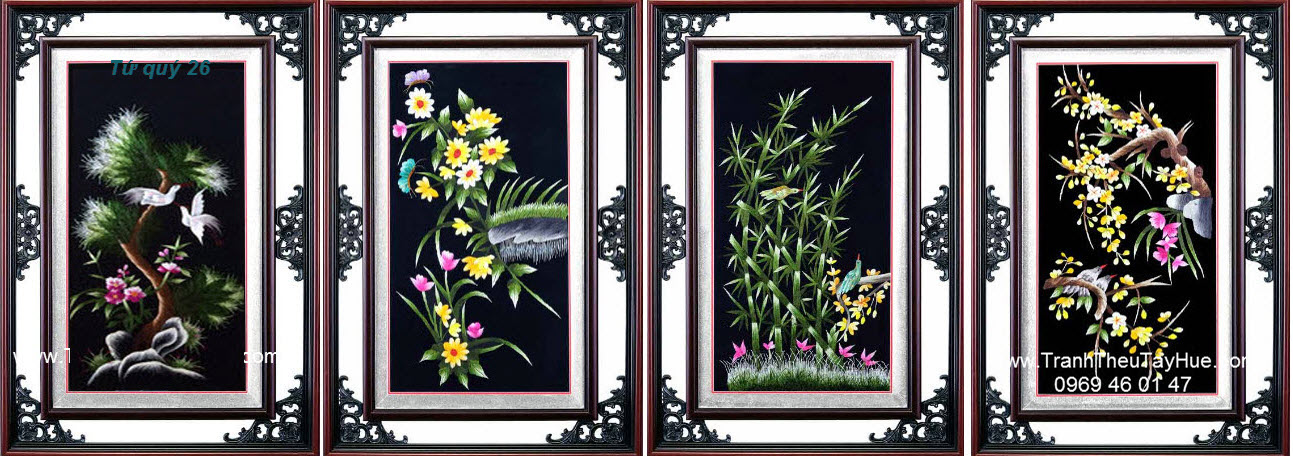 Tranh thêu tay truyền thống Tứ Quý Mai Lan Trúc Cúc( hoặc là một loại khác là Tứ Bình Tùng Cúc Trúc Mai) là tranh thêu truyền thống của Việt Nam được thêu HOÀN TOÀN THỦ CÔNG BẰNG TAY, bởi những thợ thêu chuyên tâm, lành nghề và dày kinh nghiệm của đất kinh thành Huế, những bức tranh Tứ Quý (Tứ Bình) này sử dụng các kỹ thuật thêu truyền thống đặc trưng của xứ Huế. Tranh thêu tay Tứ Quý Mai Lan Trúc Cúc( hoặc là một loại khác là Tứ Bình Tùng Cúc Trúc Mai) không chỉ là để trang trí mà còn mang nhiều ý nghĩa cầu may mắn, phú quý, sung túc và mang cả những yếu tố phong thủy trong đó.