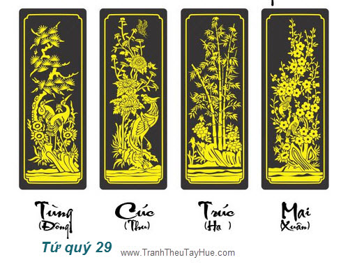 Tranh thêu tay truyền thống Tứ Quý Mai Lan Trúc Cúc( hoặc là một loại khác là Tứ Bình Tùng Cúc Trúc Mai) là tranh thêu truyền thống của Việt Nam được thêu HOÀN TOÀN THỦ CÔNG BẰNG TAY, bởi những thợ thêu chuyên tâm, lành nghề và dày kinh nghiệm của đất kinh thành Huế, những bức tranh Tứ Quý (Tứ Bình) này sử dụng các kỹ thuật thêu truyền thống đặc trưng của xứ Huế. Tranh thêu tay Tứ Quý Mai Lan Trúc Cúc( hoặc là một loại khác là Tứ Bình Tùng Cúc Trúc Mai) không chỉ là để trang trí mà còn mang nhiều ý nghĩa cầu may mắn, phú quý, sung túc và mang cả những yếu tố phong thủy trong đó.