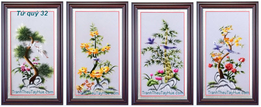 Tranh thêu tay truyền thống Tứ Quý Mai Lan Trúc Cúc( hoặc là một loại khác là Tứ Bình Tùng Cúc Trúc Mai) là tranh thêu truyền thống của Việt Nam được thêu HOÀN TOÀN THỦ CÔNG BẰNG TAY, bởi những thợ thêu chuyên tâm, lành nghề và dày kinh nghiệm của đất kinh thành Huế, những bức tranh Tứ Quý (Tứ Bình) này sử dụng các kỹ thuật thêu truyền thống đặc trưng của xứ Huế. Tranh thêu tay Tứ Quý Mai Lan Trúc Cúc( hoặc là một loại khác là Tứ Bình Tùng Cúc Trúc Mai) không chỉ là để trang trí mà còn mang nhiều ý nghĩa cầu may mắn, phú quý, sung túc và mang cả những yếu tố phong thủy trong đó.