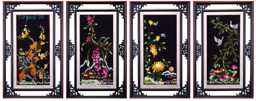 Tranh thêu tay truyền thống Tứ Quý Mai Lan Trúc Cúc( hoặc là một loại khác là Tứ Bình Tùng Cúc Trúc Mai) là tranh thêu truyền thống của Việt Nam được thêu HOÀN TOÀN THỦ CÔNG BẰNG TAY, bởi những thợ thêu chuyên tâm, lành nghề và dày kinh nghiệm của đất kinh thành Huế, những bức tranh Tứ Quý (Tứ Bình) này sử dụng các kỹ thuật thêu truyền thống đặc trưng của xứ Huế. Tranh thêu tay Tứ Quý Mai Lan Trúc Cúc( hoặc là một loại khác là Tứ Bình Tùng Cúc Trúc Mai) không chỉ là để trang trí mà còn mang nhiều ý nghĩa cầu may mắn, phú quý, sung túc và mang cả những yếu tố phong thủy trong đó.