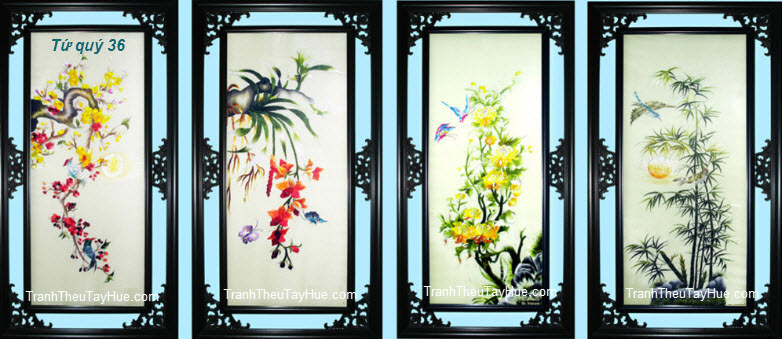 Tranh thêu tay truyền thống Tứ Quý Mai Lan Trúc Cúc( hoặc là một loại khác là Tứ Bình Tùng Cúc Trúc Mai) là tranh thêu truyền thống của Việt Nam được thêu HOÀN TOÀN THỦ CÔNG BẰNG TAY, bởi những thợ thêu chuyên tâm, lành nghề và dày kinh nghiệm của đất kinh thành Huế, những bức tranh Tứ Quý (Tứ Bình) này sử dụng các kỹ thuật thêu truyền thống đặc trưng của xứ Huế. Tranh thêu tay Tứ Quý Mai Lan Trúc Cúc( hoặc là một loại khác là Tứ Bình Tùng Cúc Trúc Mai) không chỉ là để trang trí mà còn mang nhiều ý nghĩa cầu may mắn, phú quý, sung túc và mang cả những yếu tố phong thủy trong đó.