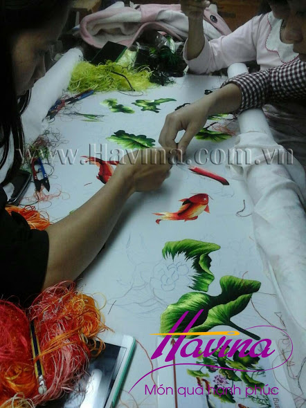 Nguyên liệu được sử dụng: Chỉ tơ kết hợp với chỉ DMC Pháp thêu trên vải lụa