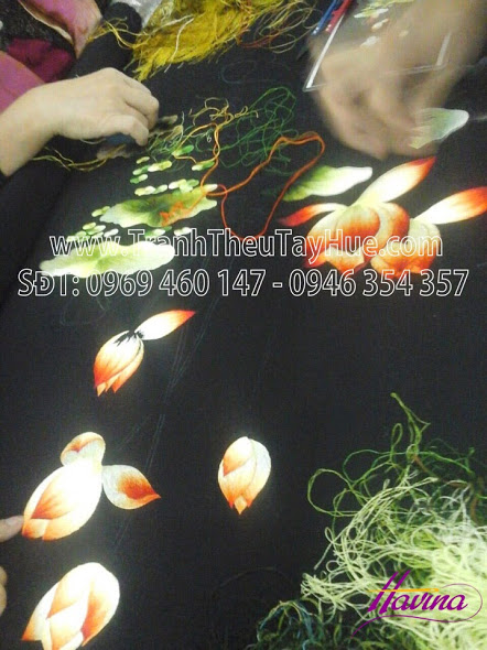 Nguyên liệu được sử dụng: Chỉ tơ kết hợp với chỉ DMC Pháp thêu trên vải lụa