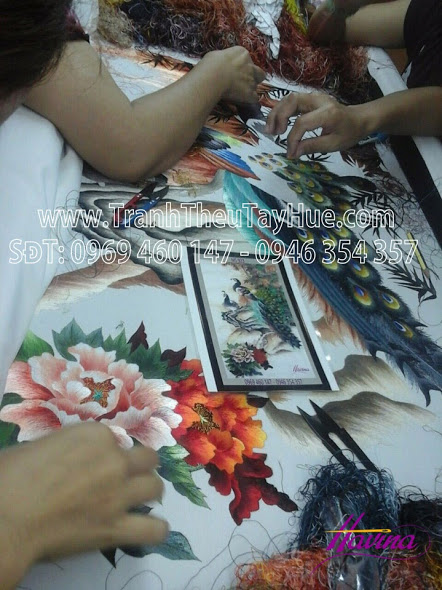 Nguyên liệu được sử dụng: Chỉ tơ kết hợp với chỉ DMC Pháp thêu trên vải lụa