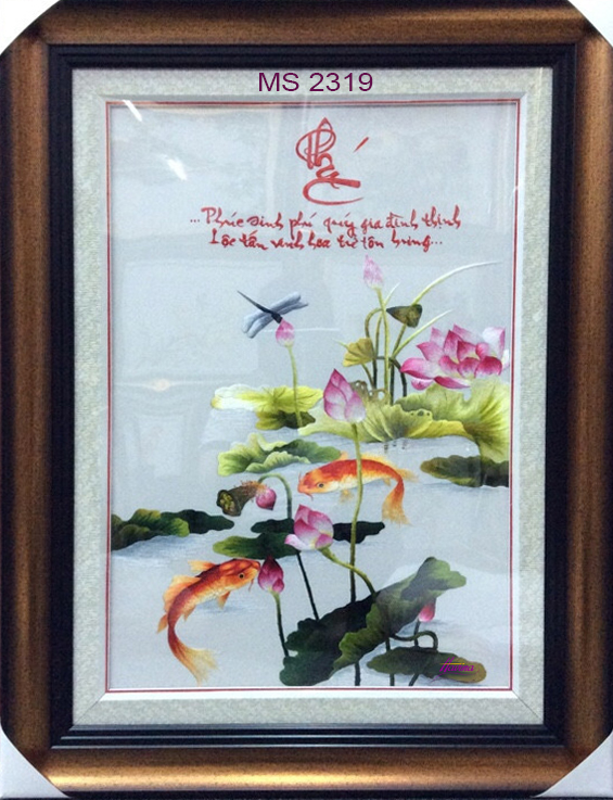 Nguyên liệu được sử dụng: Chỉ tơ kết hợp với chỉ DMC Pháp thêu trên vải lụa