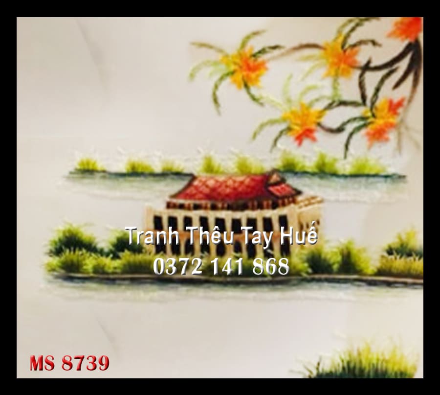 Nguyên liệu được sử dụng: Chỉ tơ kết hợp với chỉ DMC Pháp thêu trên vải lụa