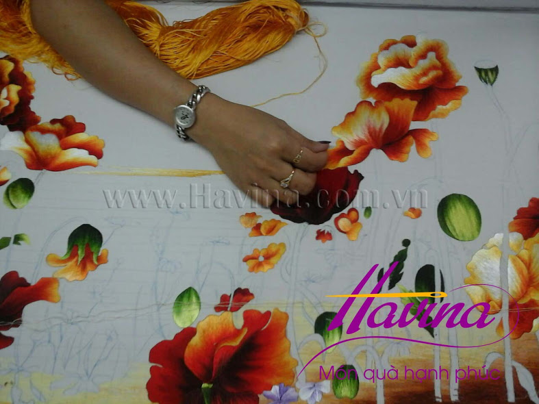 Nguyên liệu được sử dụng: Chỉ tơ kết hợp với chỉ DMC Pháp thêu trên vải lụa