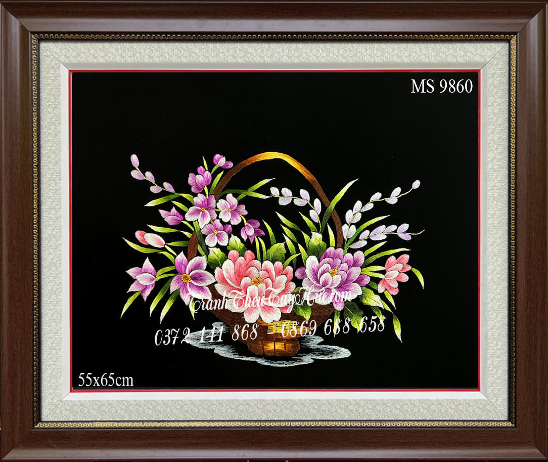 Nguyên liệu được sử dụng: Chỉ tơ kết hợp với chỉ DMC Pháp thêu trên vải lụa